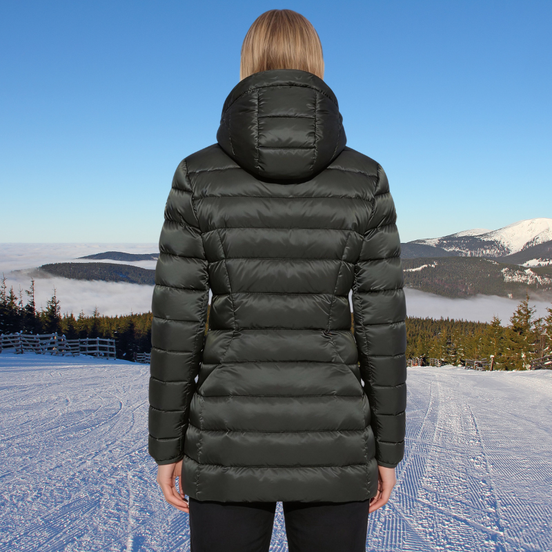 1. Mid-Length Coverage: The mid-length cut extends below the hips to shield the torso and upper thighs from cold winds and light snow, enhancing winter warmth.