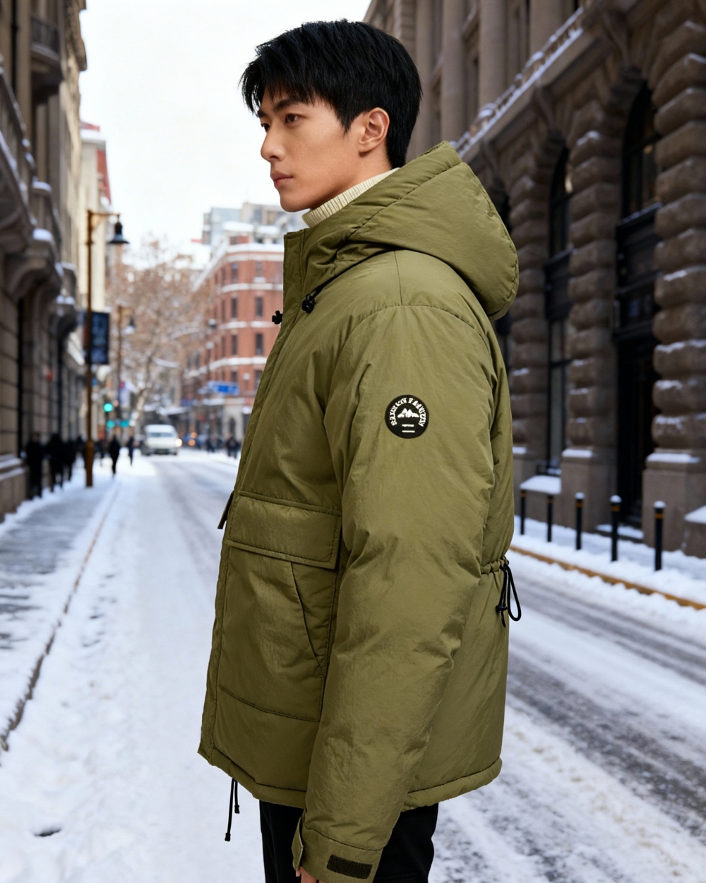 Large front patch pockets support hand warming and everyday storage needs in cold environments.