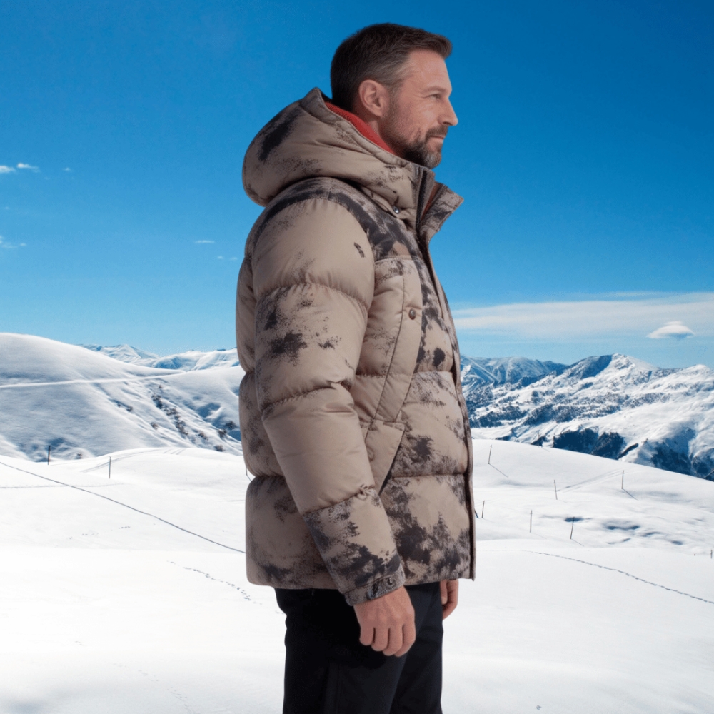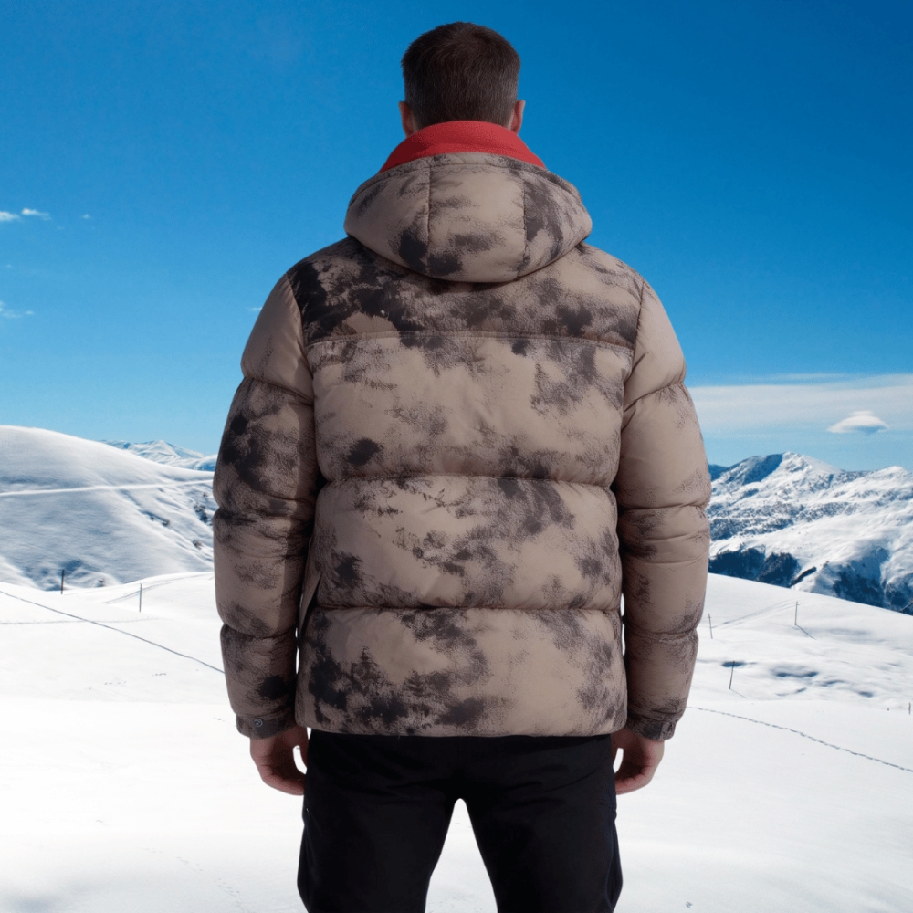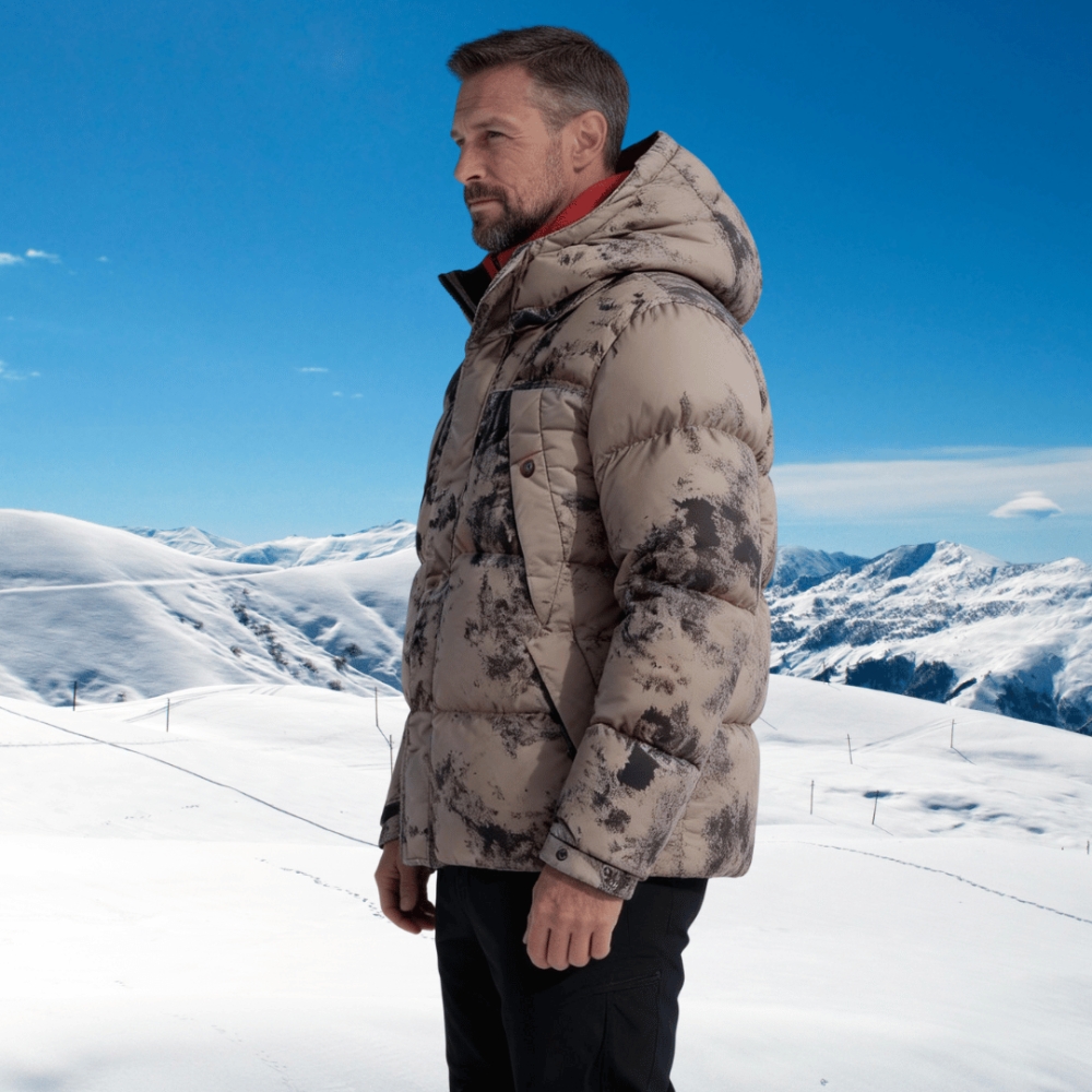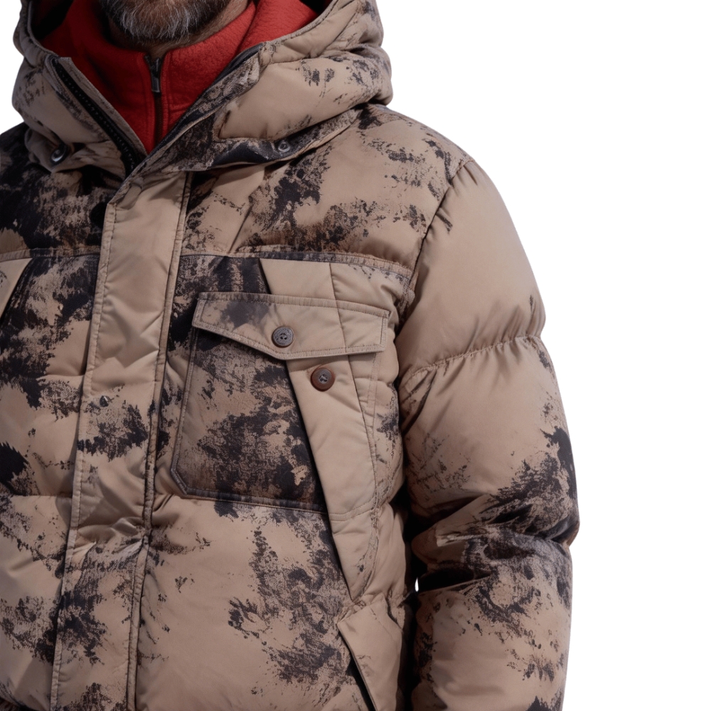 Polyester Camo Insulation: High-loft polyester padding is locked in place by horizontal quilting, delivering consistent warmth for mountain snow and city winters, while the desert camo pattern adds rugged style.