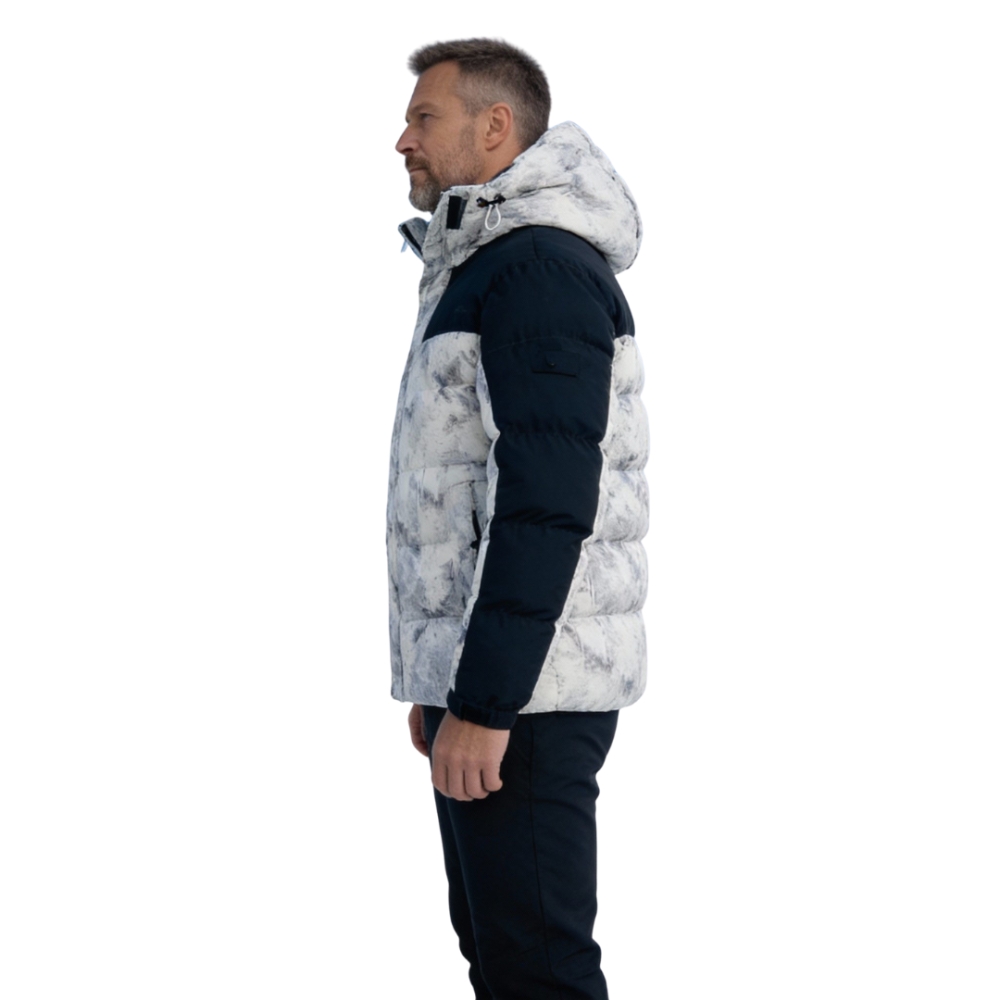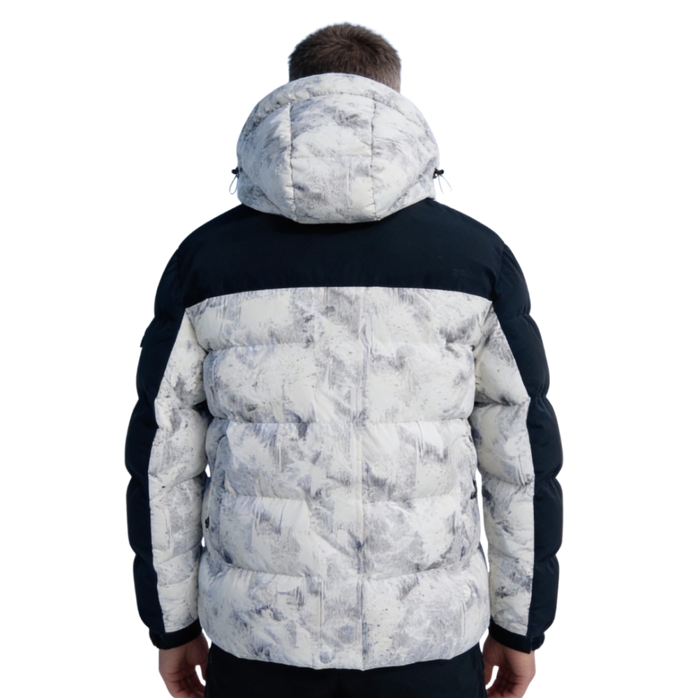 : Marble-like camo pattern combines outdoor aesthetics with fashion, blending into winter landscapes while maintaining style.