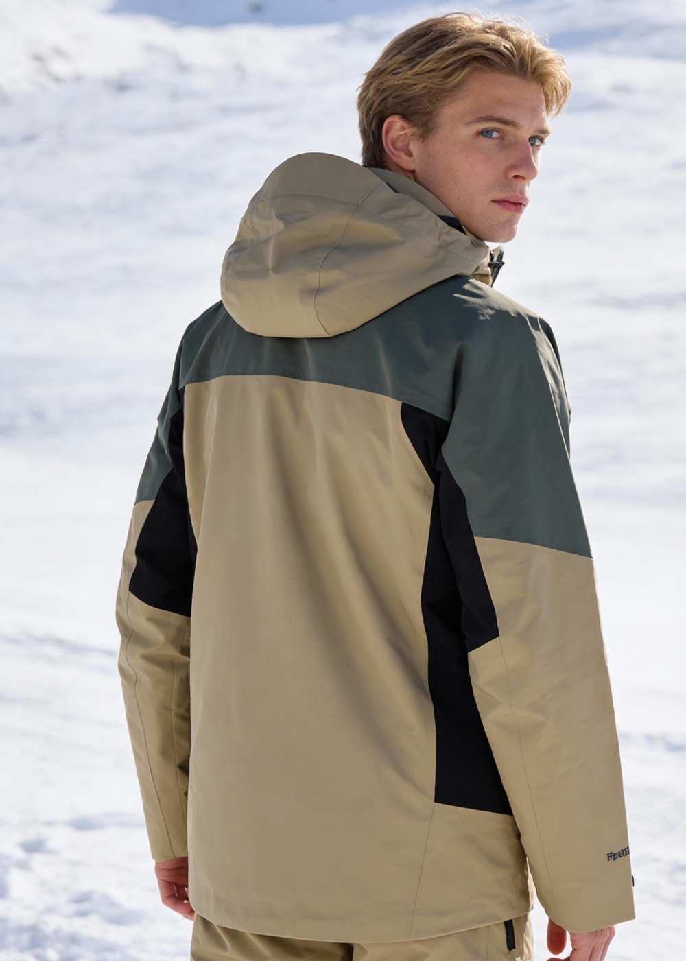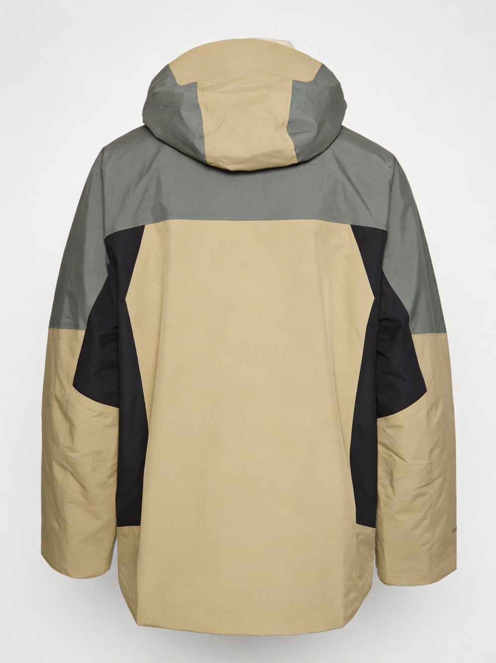 Adjustable hood, high collar, and extended front placket improve coverage against wind and light weather exposure.